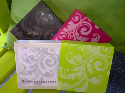 Unsere Gutscheine erhalten Sie in drei Farben: lemongrün, pink und schwarz.